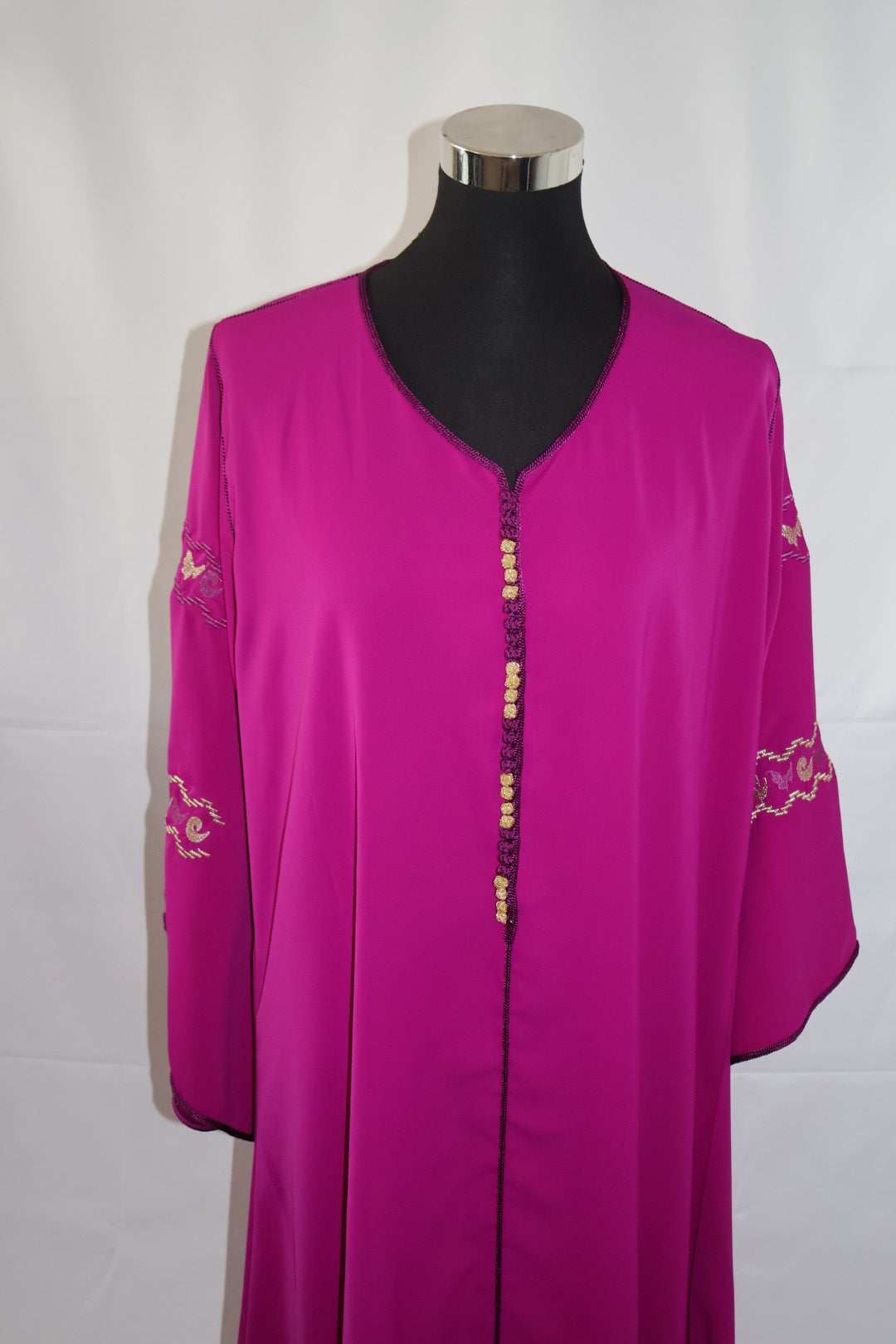 This enchanting dress is created in a traditional Moroccan tailoring workshop. It features short sleeves, a relaxed and loose fit, and an ankle-length hem. The high-quality, typically Moroccan pattern on the chest adds style and elegance to the dress. It's available in one size and is designed to fit every body shape.