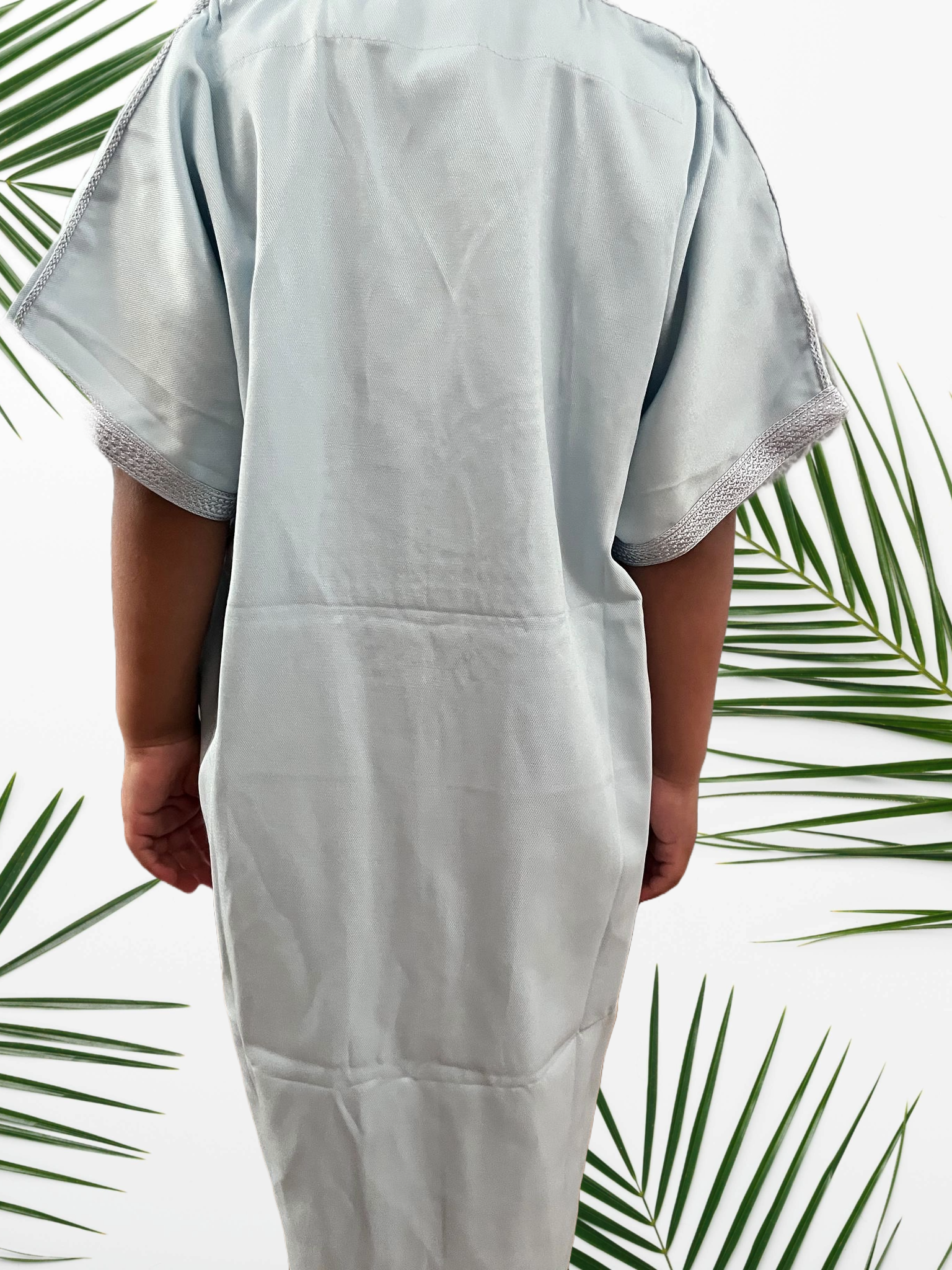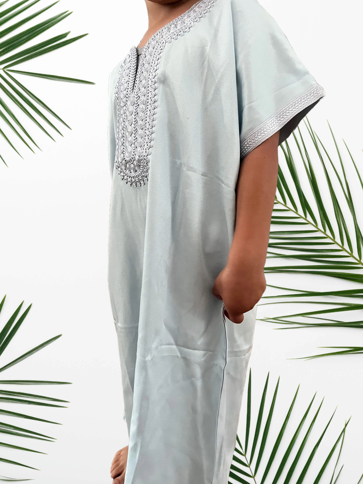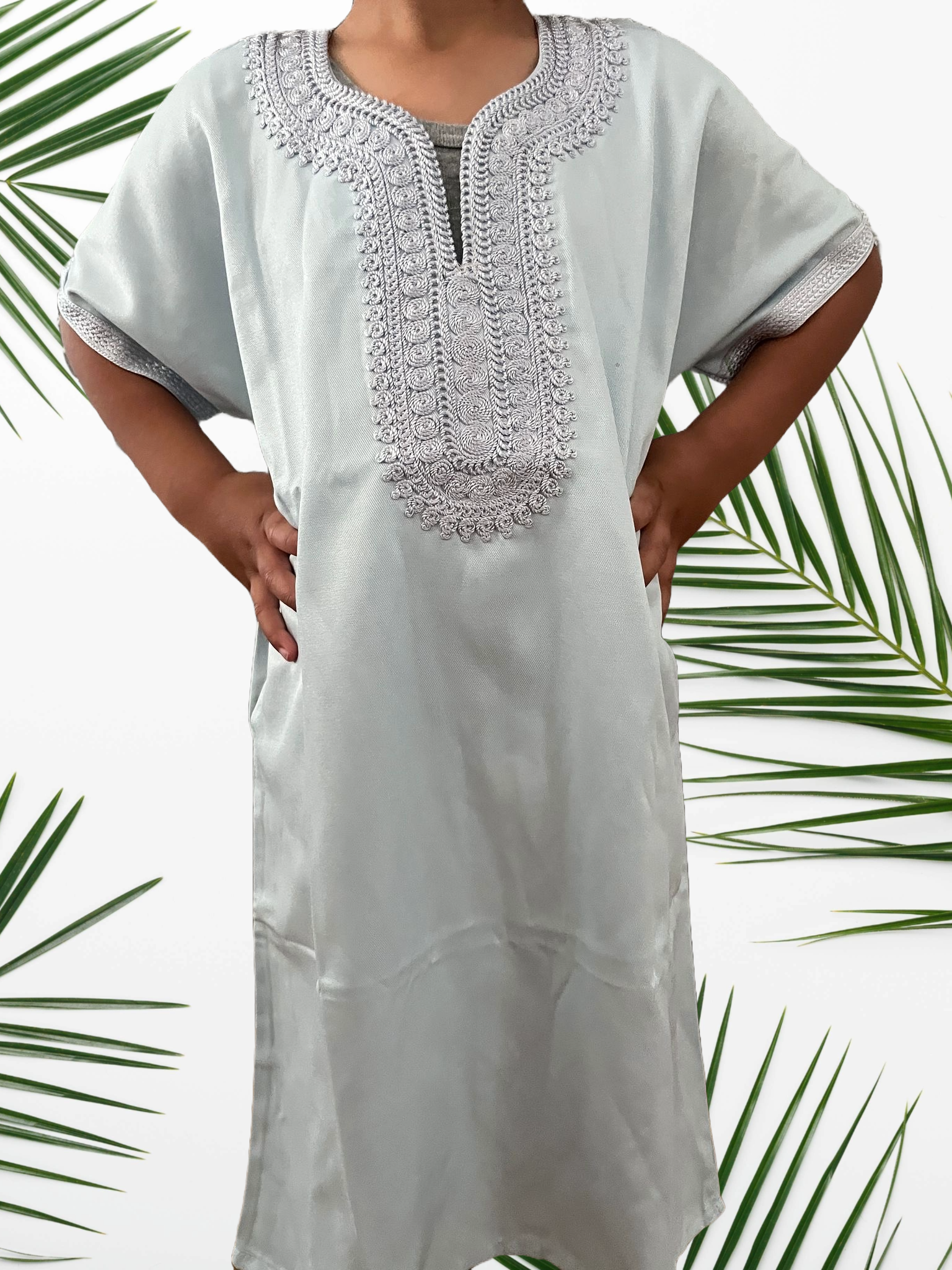 This beautiful children's gandoura is the perfect blend of traditional Moroccan craftsmanship and modern quality. The lightweight, soft fabric feels pleasant against the skin and is ideal for warm days or festive occasions. The comfortable cut with short sleeves ensures children can move freely – whether playing, celebrating, or relaxing.
