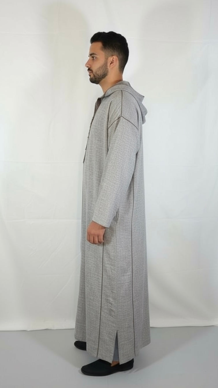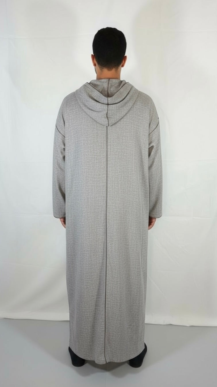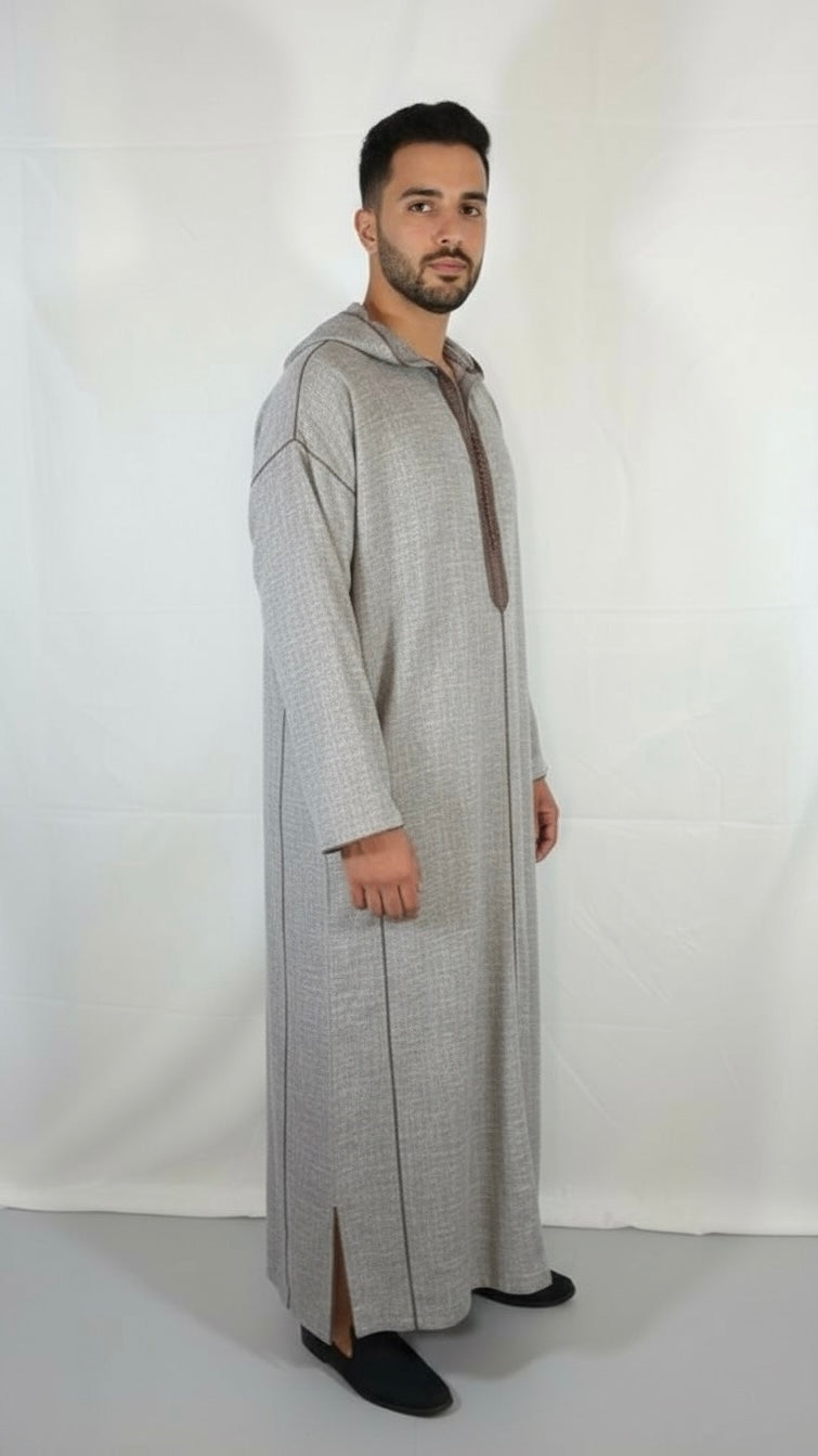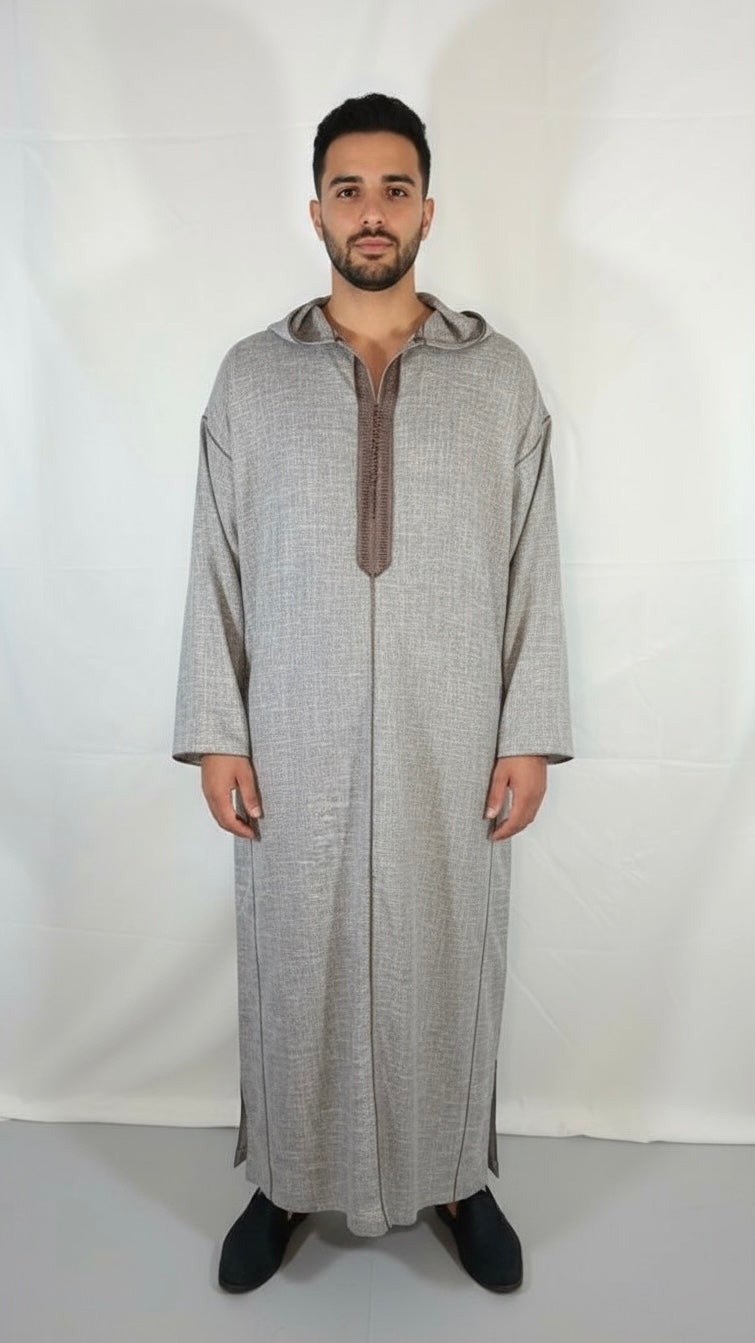 The traditional Moroccan hood gives the kaftan an authentic yet elegant look.
