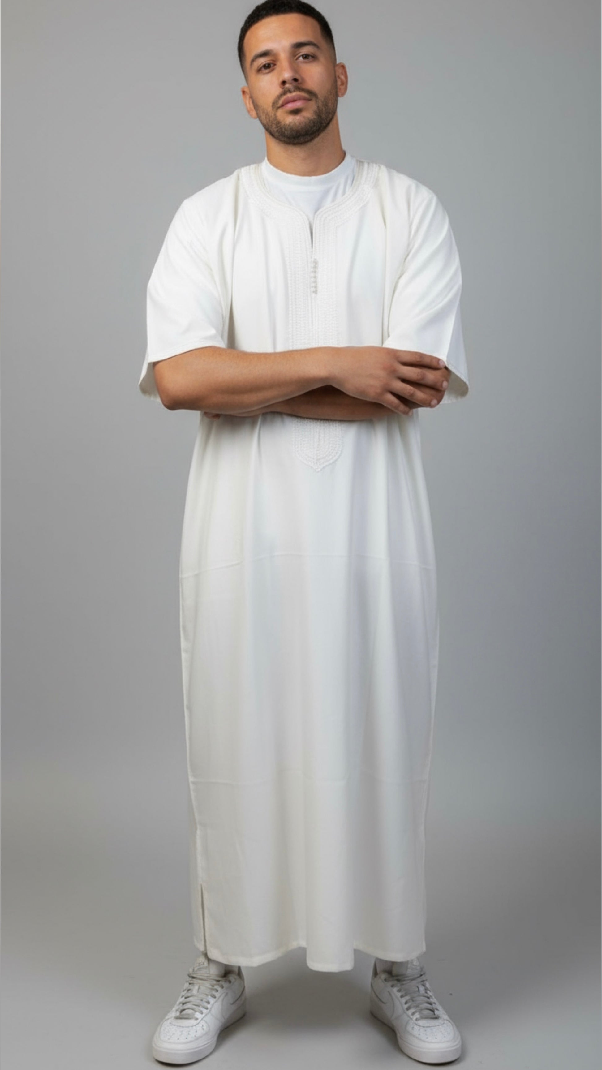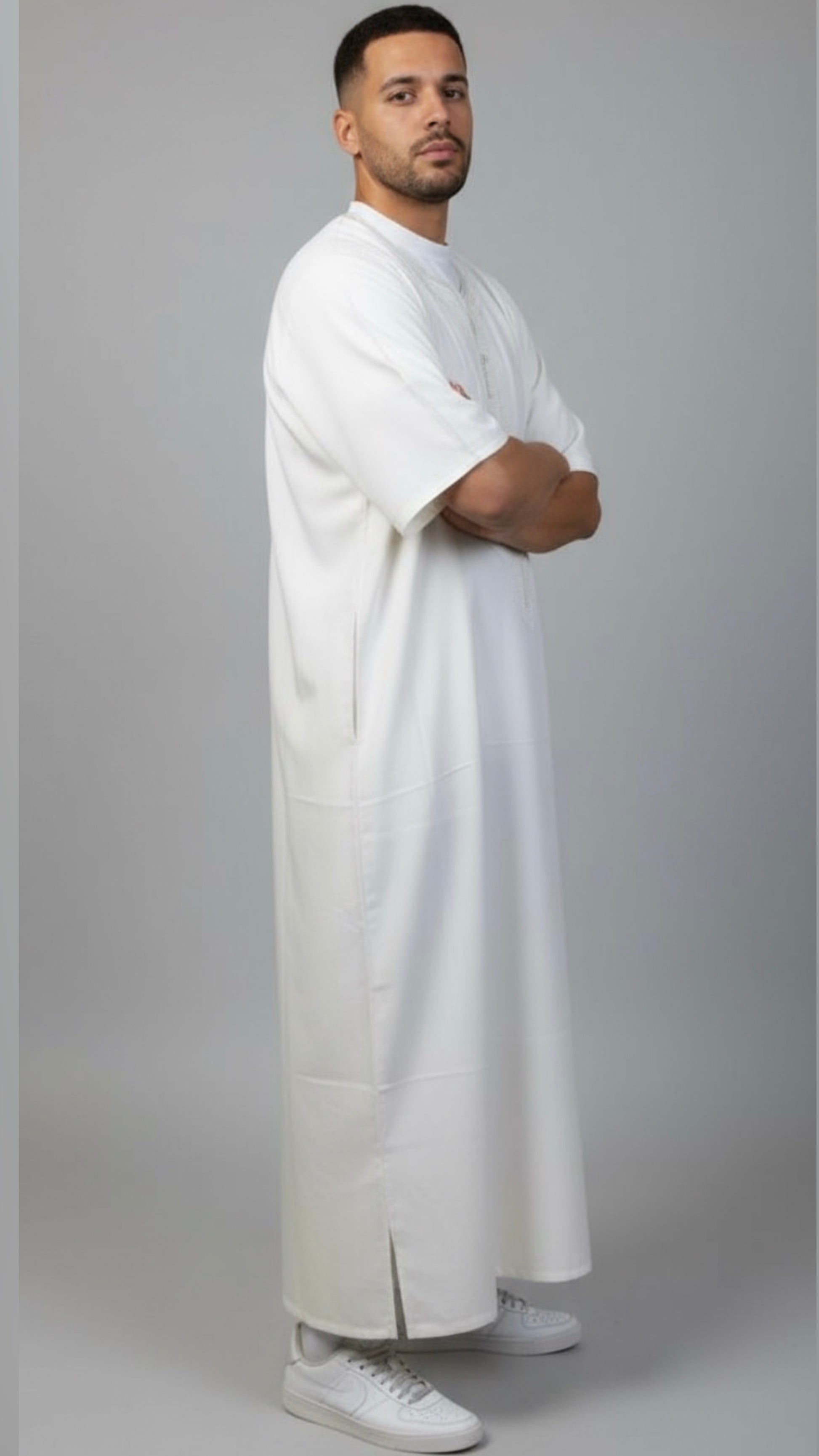 In einer traditionellen Schneiderei in Marokko entsteht dieses königliche Gewand. Es besticht durch kurze Ärmel, einen entspannten und lockeren Schnitt sowie eine Länge bis zum Knöchel. Das hochwertige und typisch-marokkanische Muster auf der Brust verleiht dem Kleid Stil und Eleganz. Erhältlich ist sie in mehreren Größen und wurde so konzipiert, dass sie zu jeder Körperform passt.
